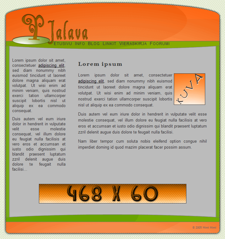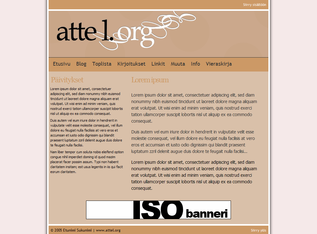AtteL.org tilasi alunperin tämän sivupohjan weblogilleen. Sivupohjan käyttötarkoitus muuttui vielä rakentaessani tätä lay-outtia... Lopulta tästä tulikin Attel.org:n ulkoasu.