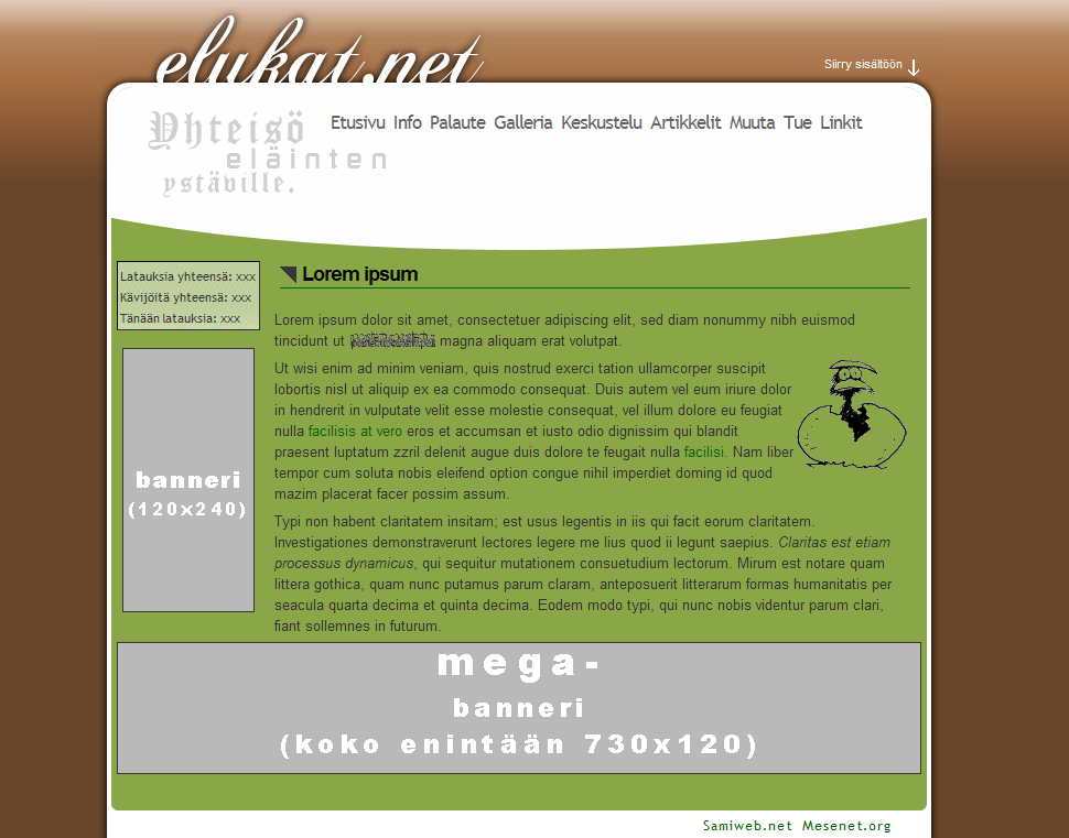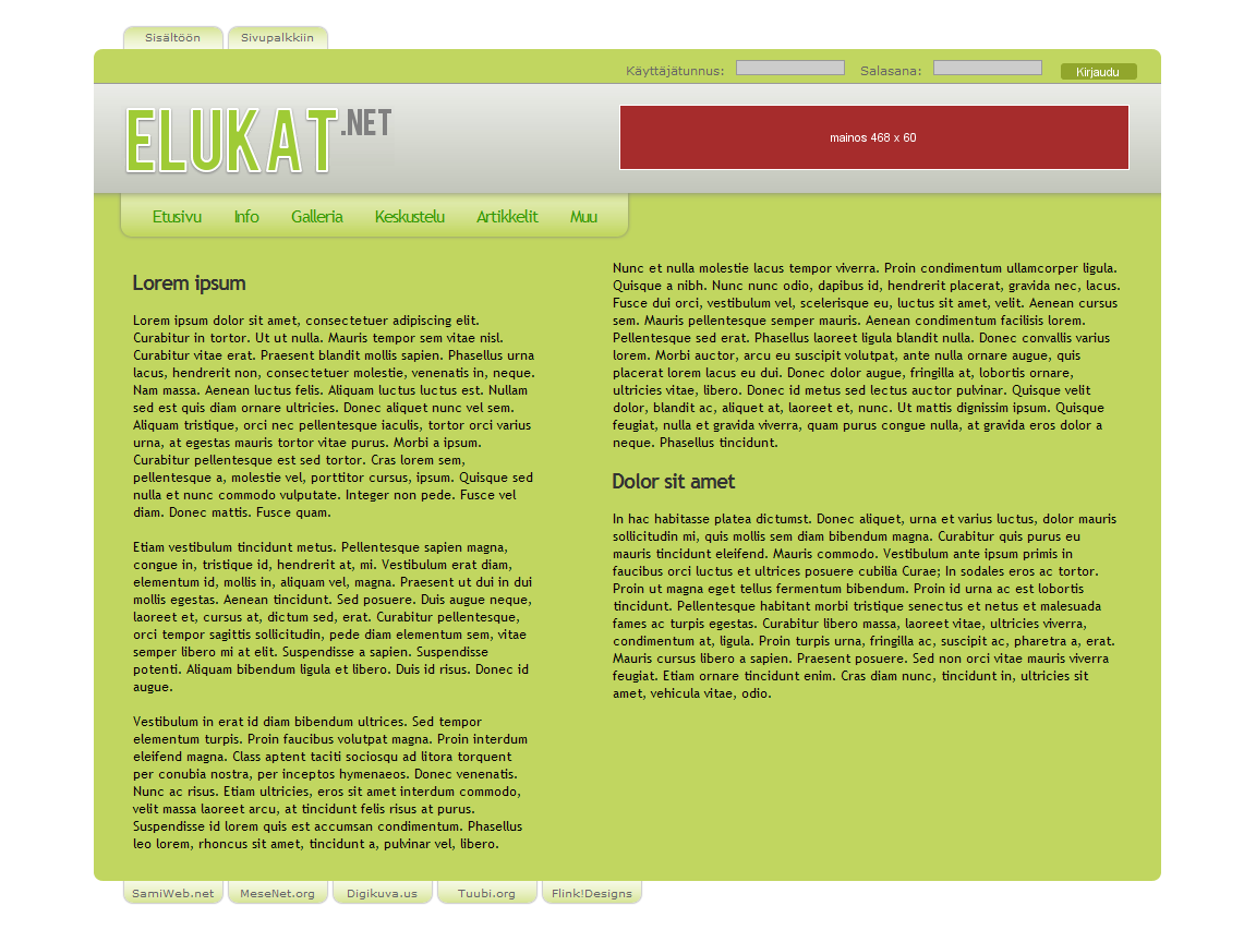 Toteuttamani Web-sivupohja Elukat.net -nimiselle verkkosivustolle. 14. päivä toukokuuta valmistui sivupohja Elukat.net -nimiselle sivustolle. Vielä tällä hetkellä melko nuori verkkosivusto on tarkoitettu eläinten ystäville ja lemmikkieläinten omistajille.