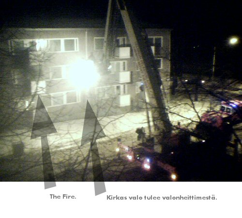 Hetken tilannetta äimisteltyäni kilautin kaverille numeroon 112 ja ilmoitin tulipalosta. Parin minuutin kuluttua soitostani saapui paikalle ensin pari poliisiajoneuvoa, sitten ambulanssi ja samalla pari palokunnan sammutusyksikköä ja jokin kolmas paloauto (saattoi olla joku palopäällikön ajoneuvo tai vastaava).