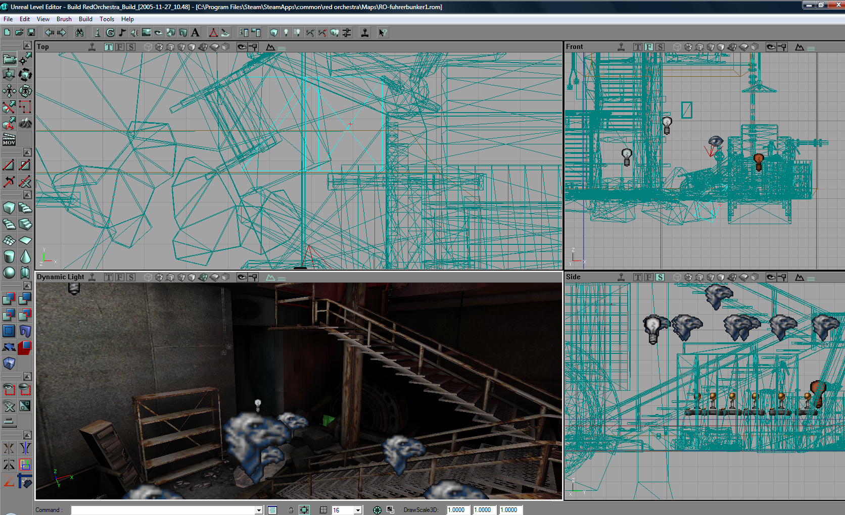 Piti kirjoittaa monistakin asioista, mutta nyt viime päivinä pääsi puraisemaan sellainen pelikenttäkärpänen, joka on saanut meikäpojan möllöttämään tässä masiinan ääressä turhankin paljon. Olen tykästynyt Red Orchestra -pelistä, josta olenkin täällä aika paljon kirjuutellut viimeisen bloggausvillityksen aikana. Tuossa Steamin kautta ladattavassa pelissä on mahdollisuus luoda omia pelattavia kenttiä käyttämällä UnrealEd-nimistä editoria. Se on aika pitkälti samanlainen toosa kuin esimerkiksi Radiant tai Graydiant, jotka ovat niitä softia, joilla pyöritellään pelikentät Call Of Dutyn vanhempien versioiden käyttöön. UnrealEd on saanut nimensä siitä kun se on Unreal-pelimoottorin peleihin kehitetty härdelli. Koska Red Orchestra ja sen pian ilmestyvä seuraaja, eli Heroes of Stalingrad, käyttää tätä samaa peliengineä, myös peliratojen luominen samalla soft… No joo, eli siis kirjoittelen siitä nettikiusaamisesta viimeistään sen jälkeen kun saan ensimmäisen peliradan valmiiksi. Teen ensimmäiseksi bunkkeria (kts. kuva), koska siinä ei tarvita välttämättä taivasta eikä auringonvaloa. En osaa vielä tehdä skyboksia.